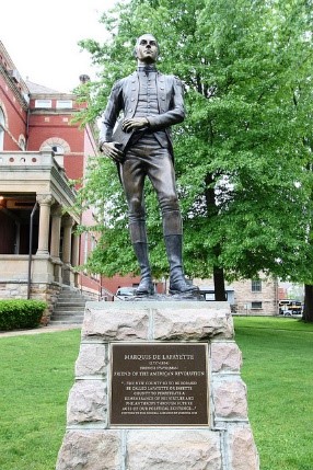 Statue of Marquis de La Fayette on the front lawn of Courthouse district Fayetteville.